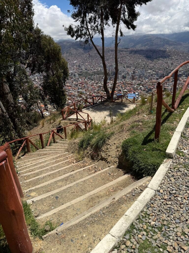 In front of the lookout offers fantastic views of the city center. Looking further up offers views towards El Alto and the Altiplano (high tablelands). Looking to your left offers sensational views of Miraflores and Hernando Siles Stadium. Furthermore, on a clear day you will get an amazing view of La Paz’s most iconic snow-capped symbol, Illimani. Looking right will bring Plaza Murillo and the Bolivian Government buildings into view.